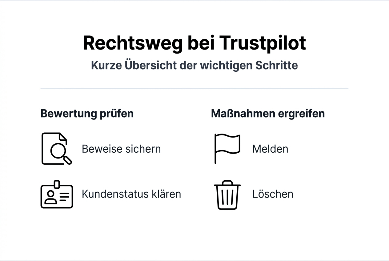 Wenn Sie eine rechtswidrige Bewertung identifiziert haben, stehen Ihnen mehrere rechtliche Wege offen. Der erste Schritt ist meist eine direkte Meldung an Trustpilot über deren Meldefunktion. Die Plattform prüft dann, ob die Bewertung ihre Richtlinien verletzt.