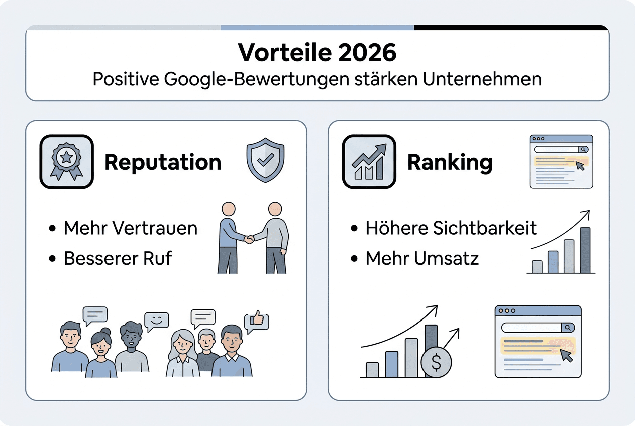 Positive Google-Bewertungen sind für Unternehmen in Deutschland längst keine Nebensache mehr. Studien belegen, dass 98% der Verbraucher Online-Bewertungen lesen, bevor sie eine Kaufentscheidung treffen. Diese digitalen Empfehlungen beeinflussen nicht nur das Vertrauen potenzieller Kunden, sondern wirken sich direkt auf die Sichtbarkeit in lokalen Suchergebnissen und damit auf den Umsatz aus. Dieser Artikel zeigt Ihnen konkret, wie positive Google-Bewertungen Ihr Ranking verbessern, welche rechtssicheren Strategien Sie 2026 anwenden können und wie Sie nachhaltig von authentischen Kundenmeinungen profitieren.